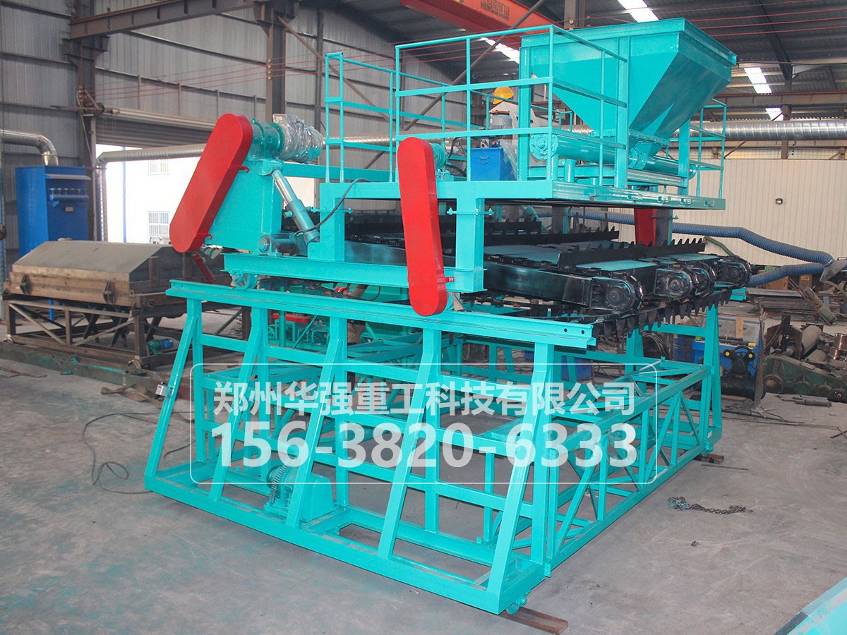 整機工作架置于發(fā)酵槽上,可沿槽上軌道縱向前后行走。翻拋小車置于工作架上,翻拋部件和液壓系統(tǒng)安裝在翻拋小車上。工作架到達指定的翻拋位置時,翻拋小車的翻拋部件經(jīng)由液壓系統(tǒng)操縱緩慢深入槽中,翻拋部件(鏈板)開始連續(xù)轉(zhuǎn)動,并隨工作架整體沿槽前進。翻拋部件不斷攫取槽內(nèi)物料并斜向輸送到工作架后方落下,落下的物料重新置堆。沿槽完成一個行程的作業(yè)后,液壓系統(tǒng)將翻拋部件抬升到不與物料干涉的高度,工作架整體連同小車后退至發(fā)酵槽翻拋作業(yè)的初始端。如果是寬槽,翻拋小車橫向朝左或右移動一個鏈板幅寬的距離,然后放下翻拋部件深入槽中,開始另一幅物料的翻拋作業(yè)行程。每個發(fā)酵槽翻拋次數(shù)取決于發(fā)酵槽的寬度,一般一個槽寬2~9m,每個槽完成全部翻拋需要分別進行1~5作業(yè)行程(循環(huán)),直至完成全槽翻拋作業(yè)。